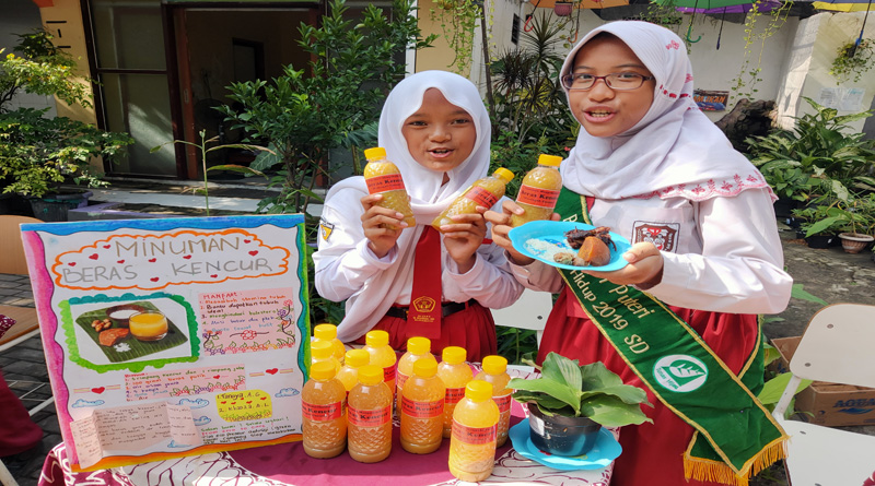 “Tiap olahan minuman herbal yang dijual di bazar ini dibuat oleh dua orang siswa kader ecopreneur SDN Dukuh Menanggal I,” tutur Wahyuni. Semua bahannya memanfaatkan tanaman yang sudah lama dirawat di sekolah.