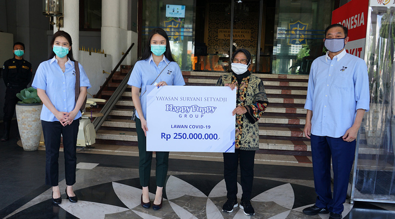Pemerintah Kota (Pemkot) Surabaya menerima bantuan dana sebesar Rp 250 juta dari Happy Puppy Group melalui Yayasan Suryani Setyadji. Bantuan dana itu diserahkan langsung oleh Pendiri Happy Puppy Group Santoso Setyadji kepada Walikota Surabaya Tri Rismaharini di Balai Kota Surabaya, Kamis (9/4/2020).