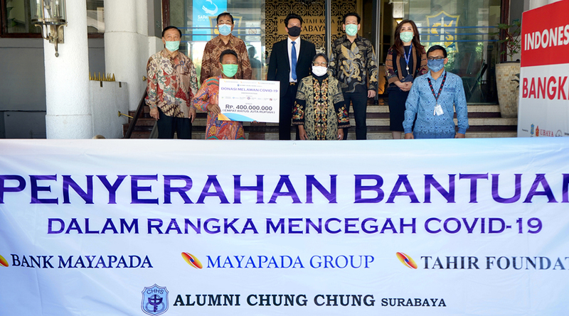 Pemerintah Kota (Pemkot) Surabaya menerima bantuan sebesar Rp 1,3 miliar dari Bank Mayapada, Mayapada Group, Tahir Foundation, dan Alumni Chung-Chung Surabaya, Kamis (9/4/2020). Bantuan yang diserahkan di Balai Kota Surabaya itu diterima langsung oleh Walikota Surabaya Tri Rismaharini.