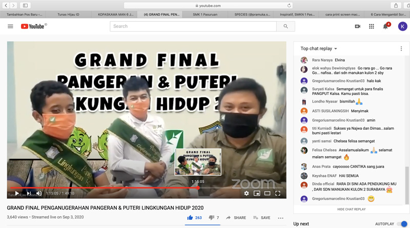 Puncak Penganugerahan Pangeran dan Puteri Lingkungan Hidup 2020 digelar melalui Live Youtube saluran TUNAS HIJAU ID, Kamis (3/9/2020). Aktivis Tunas Hijau Richi Razak memandu puncak penganugerahan yang dimulai pukul 19.30 WIB ini.