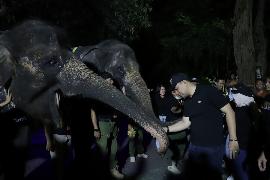 Tiba di KBS, Wali Kota Eri bersama istri langsung disambut oleh gajah dan diberi kalungan bunga. Setelah itu, Wali Kota Eri langsung keliling KBS menikmati kebun binatang Surabaya pada saat malam hari.