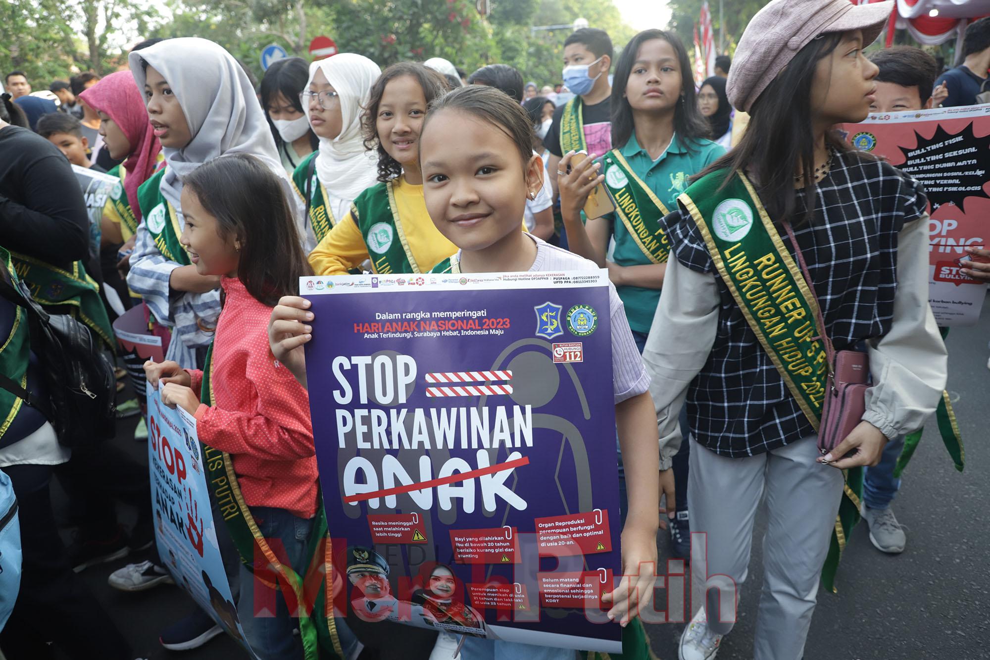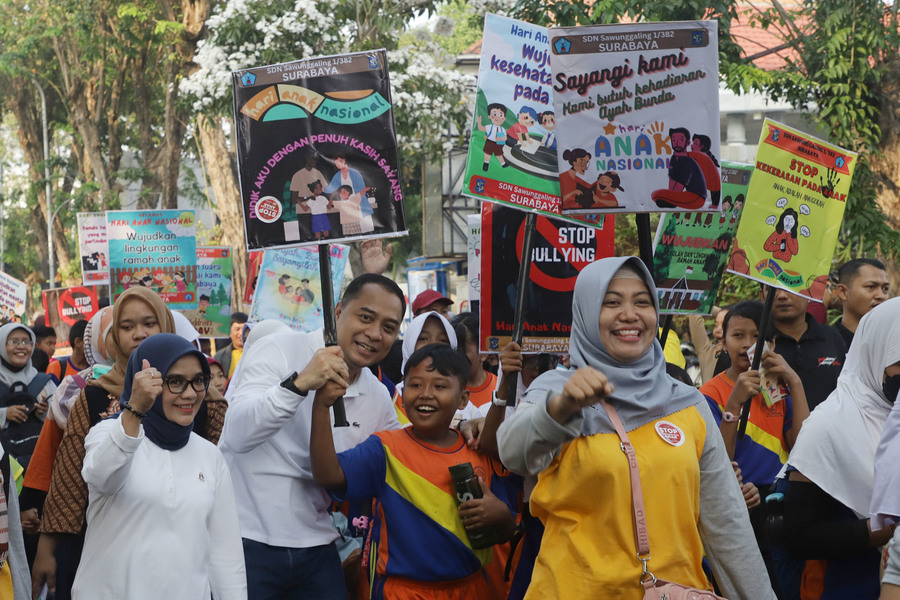 Di Peringatan Hari Anak Nasional (HAN) 2023, Pemerintah Kota (Pemkot) Surabaya melalui Dinas Pemberdayaan Perempuan, dan Perlindungan Anak, serta Pengendalian Penduduk, dan Keluarga Berencana (DP3A-PPKB) menggelar Parade Stop Kekerasan dan Pernikahan Dini pada Anak di Taman Bungkul, Minggu (23/7/2024). Dalam kesempatan ini, Wali Kota Surabaya Eri Cahyadi dan Bunda Paud Kota Surabaya Rini Indriyani turut hadir sekaligus memberangkatkan rombongan.